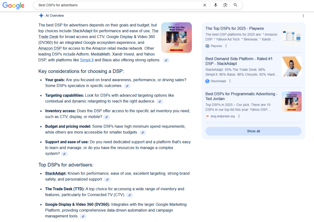- DSP StackAdapt’s own blog helped land it in AI-generated SERPs.