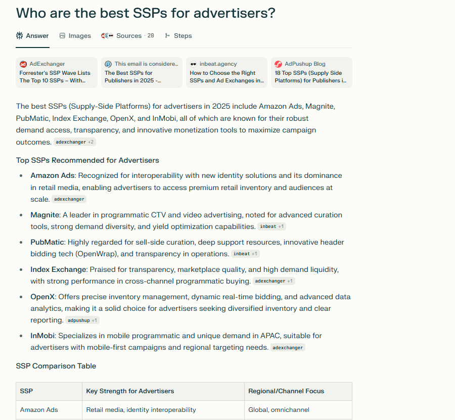 ❓ PR Takeaway: If your PR partner overstates the impact of earned coverage, be skeptical. Many are still trying to preserve their legacy role as gatekeepers to media. In the new model, the best adtech PR experts will help you create search-optimized content across key platforms and support your sponsored content strategy where appropriate. Additionally, the best partners will help steer how earned coverage references a vendor to ensure optimal placement in AI SERPs down the line.